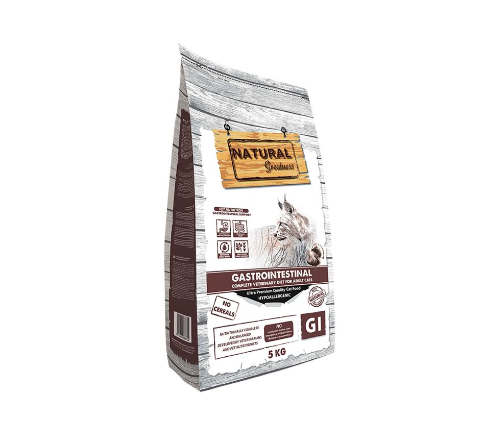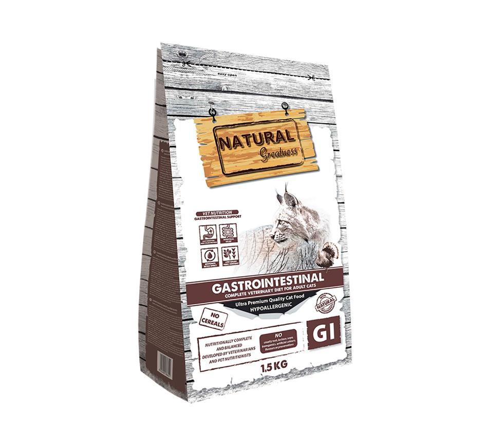 Natural Greatness Gastrointestinal é um produto completo, sem cereais, hipoalergénico. Ração de prescrição para gatos adultos com distúrbios de absorção intestinal.