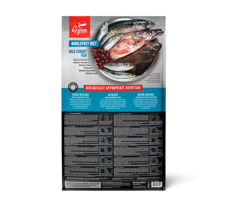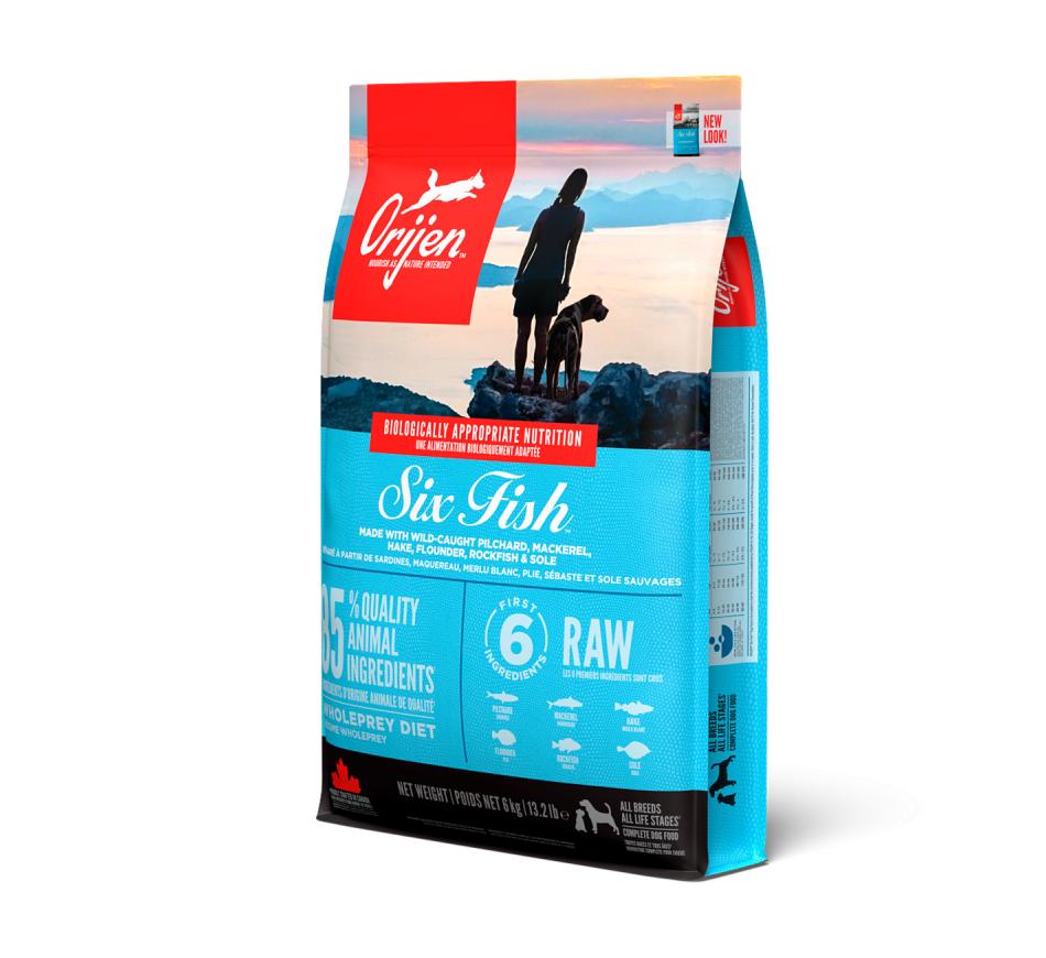 Por este motivo, o alimento Biologicamente Adequado orijen 6 fish apresenta incomparáveis inclusões de peixe inteiro de água salgada e de água doce, de captura selvagem, todos pescados na nossa região e entregues frescos diariamente, assegurando saúde e nutrição completa do seu cão.