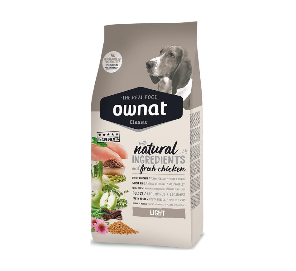 Ownat Classic Light é uma ração elaborada com 35% de carne, 10% carne frango fresco, arroz integral, ervilhas, maçãs e outros ingredientes de qualidade. Também incorpora óleo de salmão para o cuidado da pele e do pelo e levedura de cerveja para proteger o sistema imunológico.