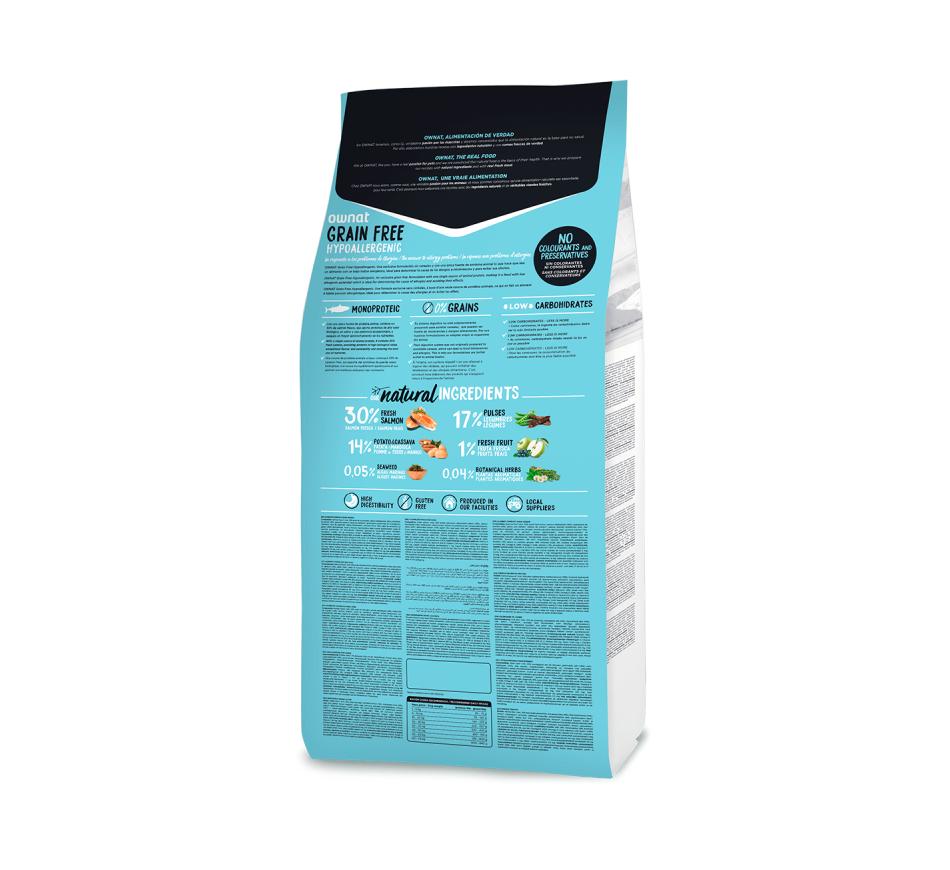 Ownat Cão Grain Free Hypoallergenic é uma ração super premium que utiliza uma única fonte de proteína animal, o Salmão. A ausência de cereais, grain free, bem como os ingredientes de primeira qualidade, reduz a possibilidade de intolerância ou alergia ao alimento, sendo também uma ração com um grau de digestibilidade elevado, tornando mais fácil a digestão.