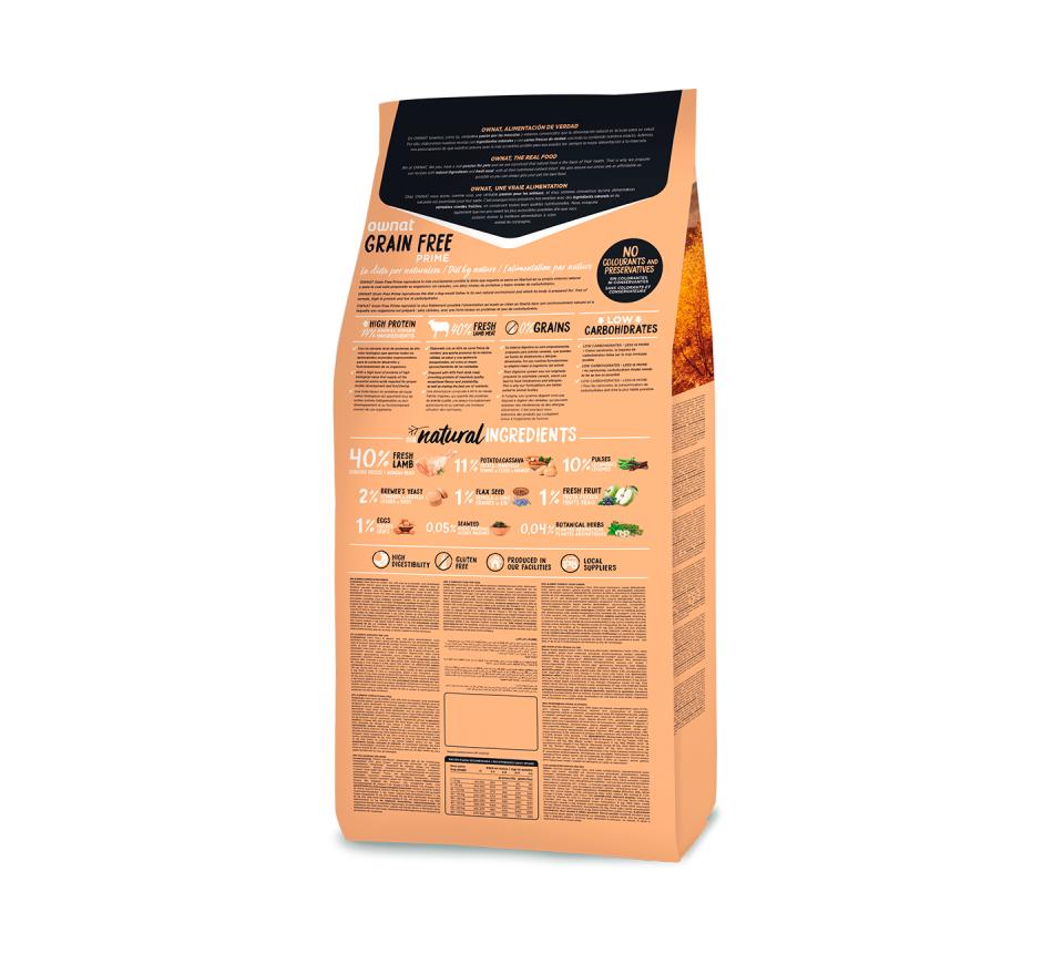 Ownat Grain Free Prime Junior Lamb incorpora óleo de peixe, rico em ácidos gordos ómega 3 e ómega 6 para uma pele e um pelo saudáveis, contém glucosamina e a condroitina, componentes que melhoram a saúde articular.