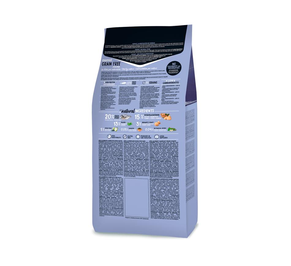 Ownat Grain Free Prime Gato Sterilised incorpora óleo de peixe, rico em ácidos gordos ómega 3 e ómega 6 para uma pele e um pelo saudáveis, contém glucosamina e a condroitina, componentes que promovem a saúde articular, essencial durante o crescimento.