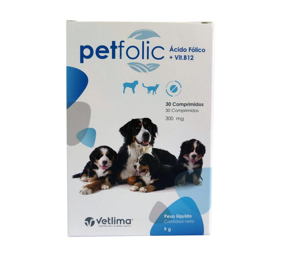 Alimento complementar dietético com ácido fólico e Vitamina B12 recomendado para cães/gatos durante a gravidez ou em casos de deficiência na absorção normal de ácido fólico (compensação da mal-absorção).