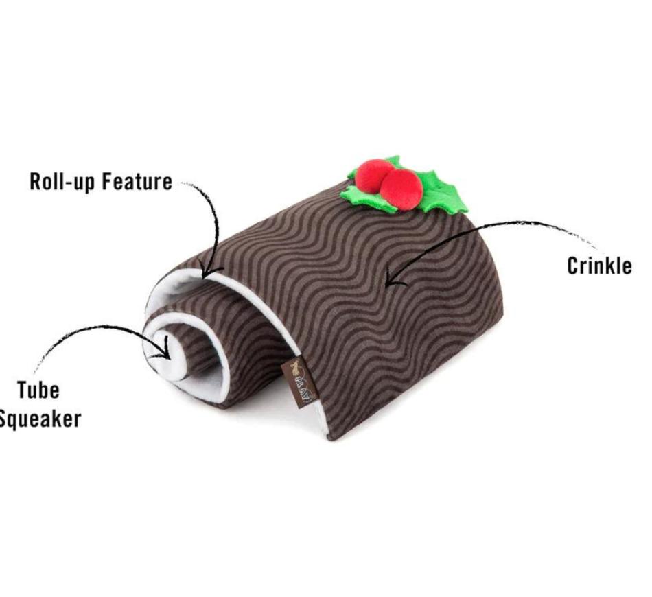 Brinquedo de Natal Yule Log, com apito e com um barulho de amarrotar característíco para melhor entusiasmar o seu cão e desfrutar ainda mais deste brinquedo