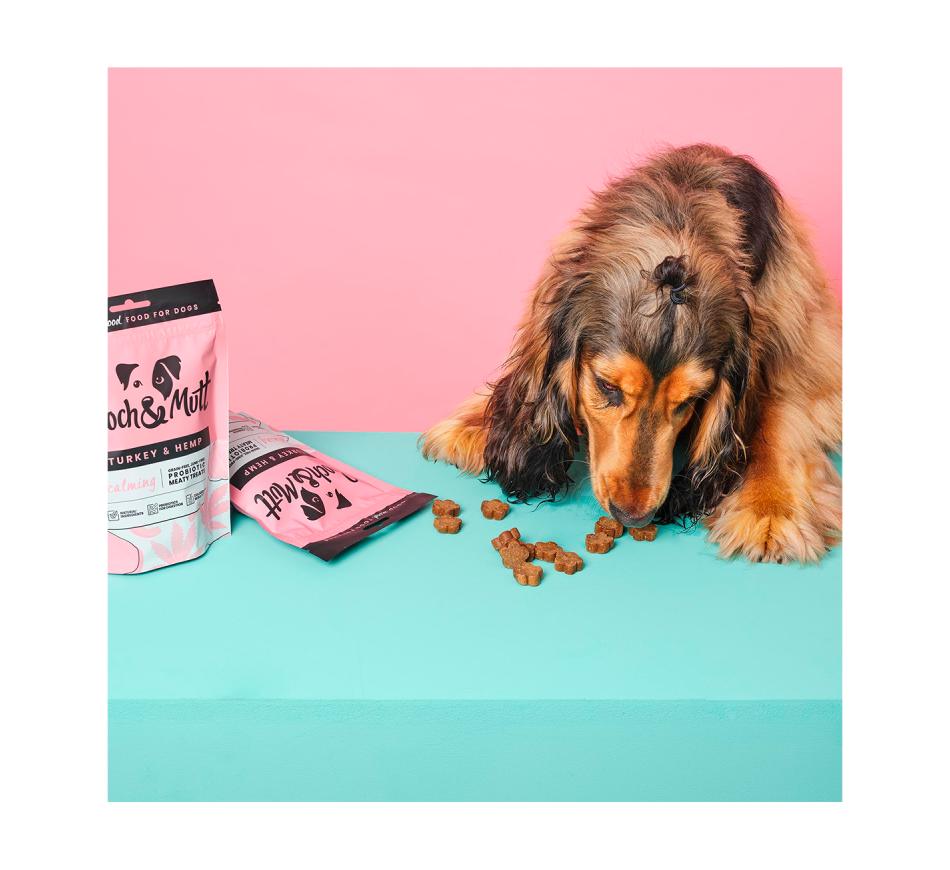Snacks proteicos grain free Calming - Peru & cânhamo que combinam super ingredientes funcionais que favorecem o bem estar, tranquilidade e relaxamento do teu cão, indicado para cães a partir dos 12 meses de idade.