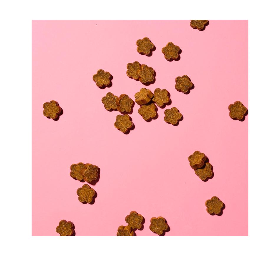 Snacks proteicos grain free Calming - Peru & cânhamo que combinam super ingredientes funcionais que favorecem o bem estar, tranquilidade e relaxamento do teu cão, nomeadamente o cânhamo, raiz de valeriana, L-triptofano, colagénio e são ainda enriquecidos com probióticos para a digestão.