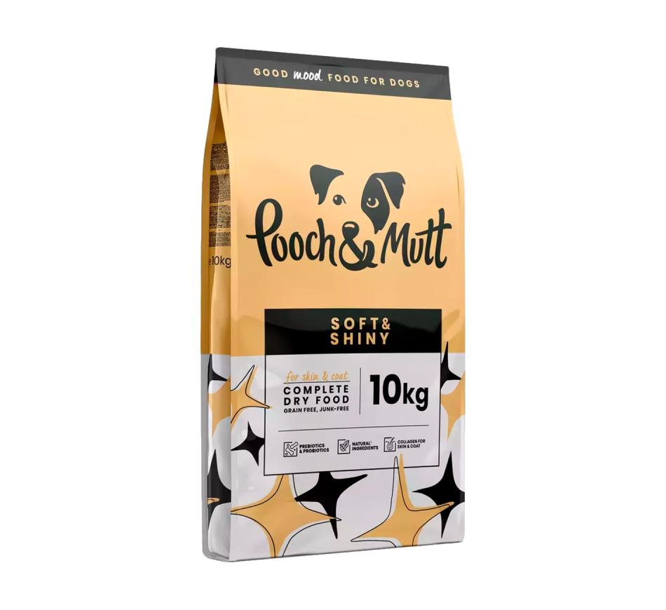 Pooch & Mutt Complet Dry food Soft & Shiny está repleta de ingredientes ativos como 47% de arenque selvagem, o que a torna muito mais fácil de digerir do que a maioria das rações com carne, rico em ácidos gordos e com colágenio uma proteina estrutural essencial para a pele. Com arenque, como única fonte de proteína animal neste alimento hipoalergénico, e sem cereais, torna-o também muito indicado para animais alérgicos. Se o seu cão sofre de alergias, uma nutrição adequada pode resolver esta situação. Esta alimentação premium contém ingredientes nutracêuticos funcionais bioativos como a linhaça, colágeno, vitamina biotina, cardo mariano e o premiado suplemento NUTRA-BIONIC.