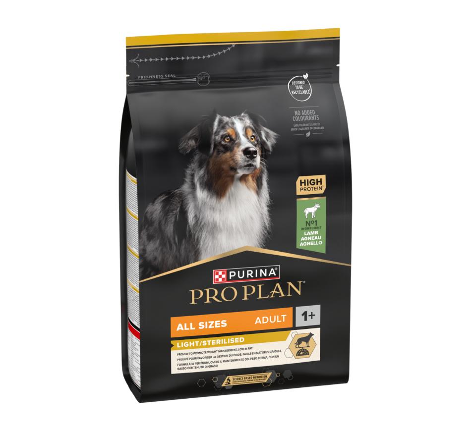 Pro Plan Cão Light Sterilised All Size Adult Borrego contém pedaços de borrego de elevada qualidade como primeiro ingrediente e um elevado teor de proteína e gordura. Um nível mais baixo de gordura promove até 60% de perda de massa gorda em 12 semanas, e posteriormente, uma manutenção saudável do peso graças ao elevado teor de proteína e ao baixo teor de gordura, quando combinado com um passeio diário. O alimento seco para cão cuidadosamente formulado ajuda a reduzir a sensação de fome através do elevado teor de proteína, fontes de hidratos de carbono complexos e teor de fibra adequado.