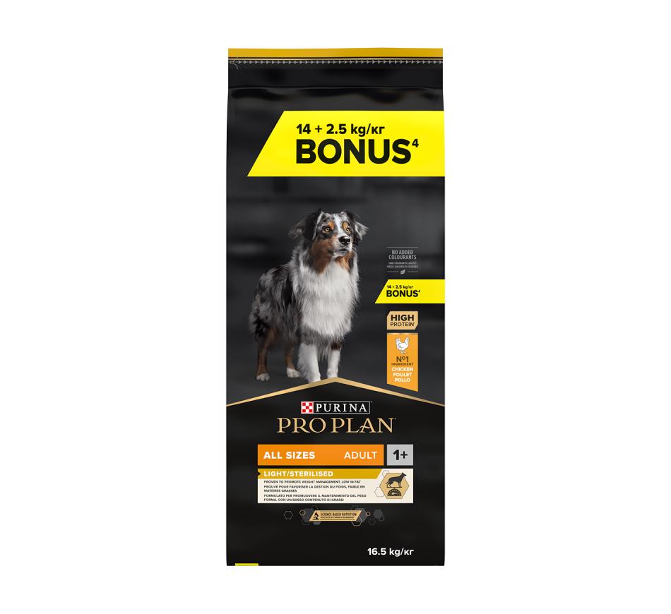 Purina Pro Plan Adulto All Sizes com OPTIWEIGHT® é um alimento seco completo para cães Adultos com excesso de peso ou esterilizados, de todos os tamanhos.