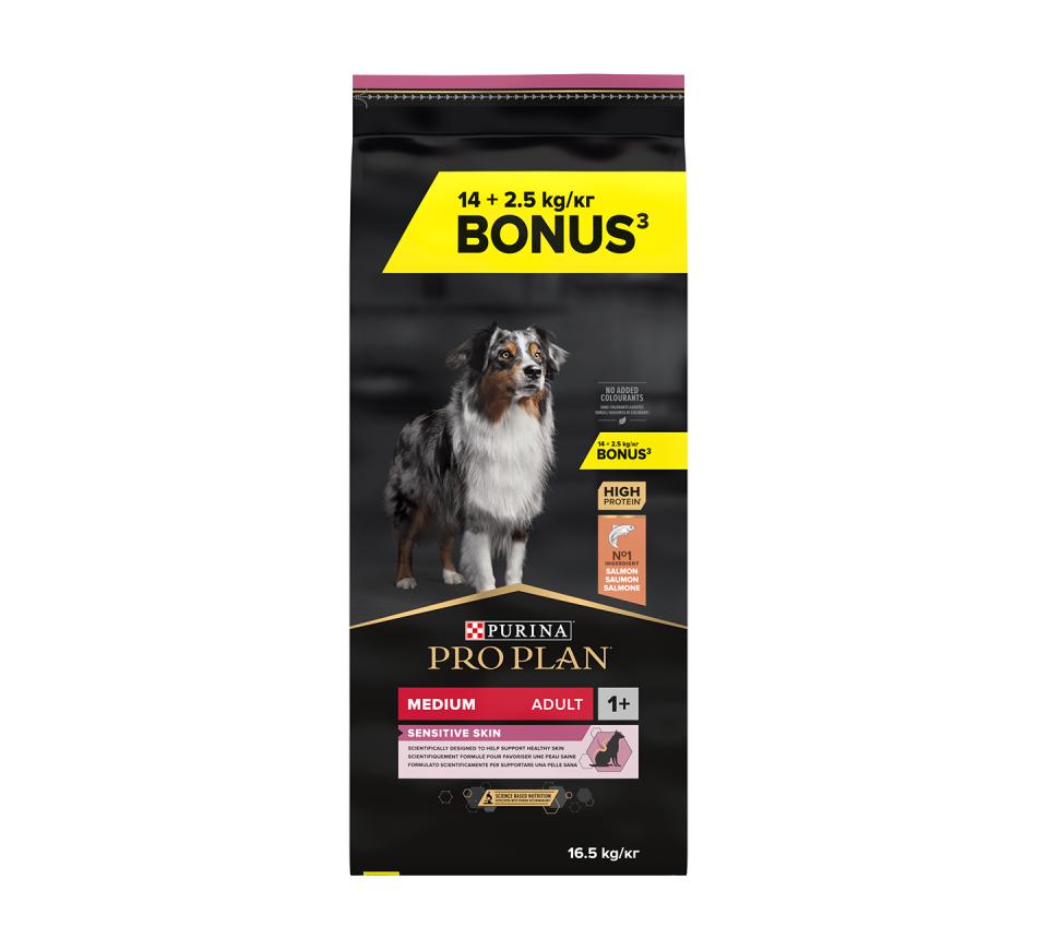 Purina Pro Plan Cão Médio Adulto com OPTIDERMA® é um alimento seco de Salmão para cães Adultos que têm pele sensível, ajuda nas suas necessidades e a tratar a sua sensibilidade.