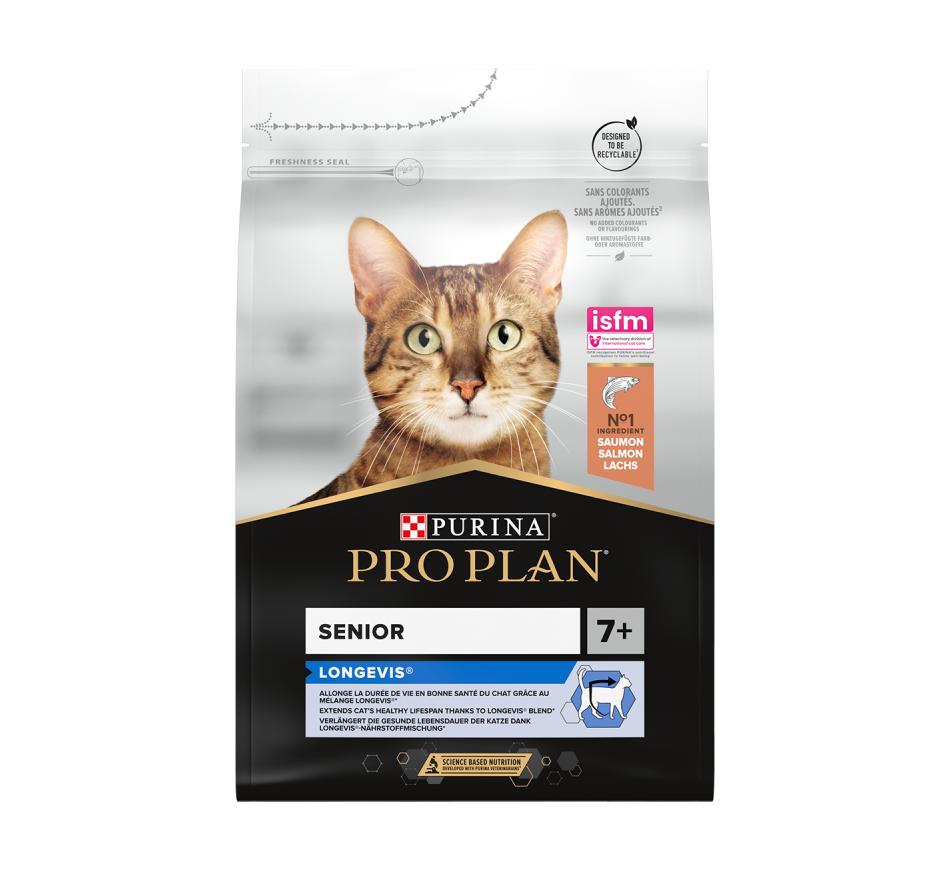 Pro Plan Gato Longevis Adult 7+ Salmão é um alimento seco completo para gatos adultos com mais de 7 anos, rico em salmão, que contém todos os nutrientes necessários para suportar a saúde a longo prazo nos gatos sénior.