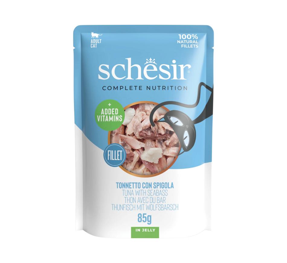 Schesir Complet Nutrition Atum e robalo em Gelatina é uma fórmula que contém todos os nutrientes essenciais — proteínas, gorduras, carboidratos, vitaminas e minerais — e que pode ser usada como fonte única de alimentação, pois fornece todo o espectro de nutrientes necessários.