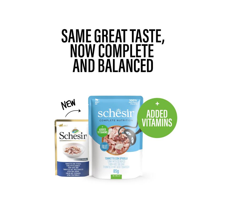 Schesir Complete Nutrition é a nova linha de alimentos húmidos completos e balanceados, com filés de carne ou peixe de verdade, cuidadosamente selecionados, e ingredientes 100% naturais e minimamente processados. Cada receita é rica em proteínas e enriquecida com vitaminas e minerais essenciais. Nutritiva, como uma presa de verdade. Formulado pela nossa equipa de veterinários.