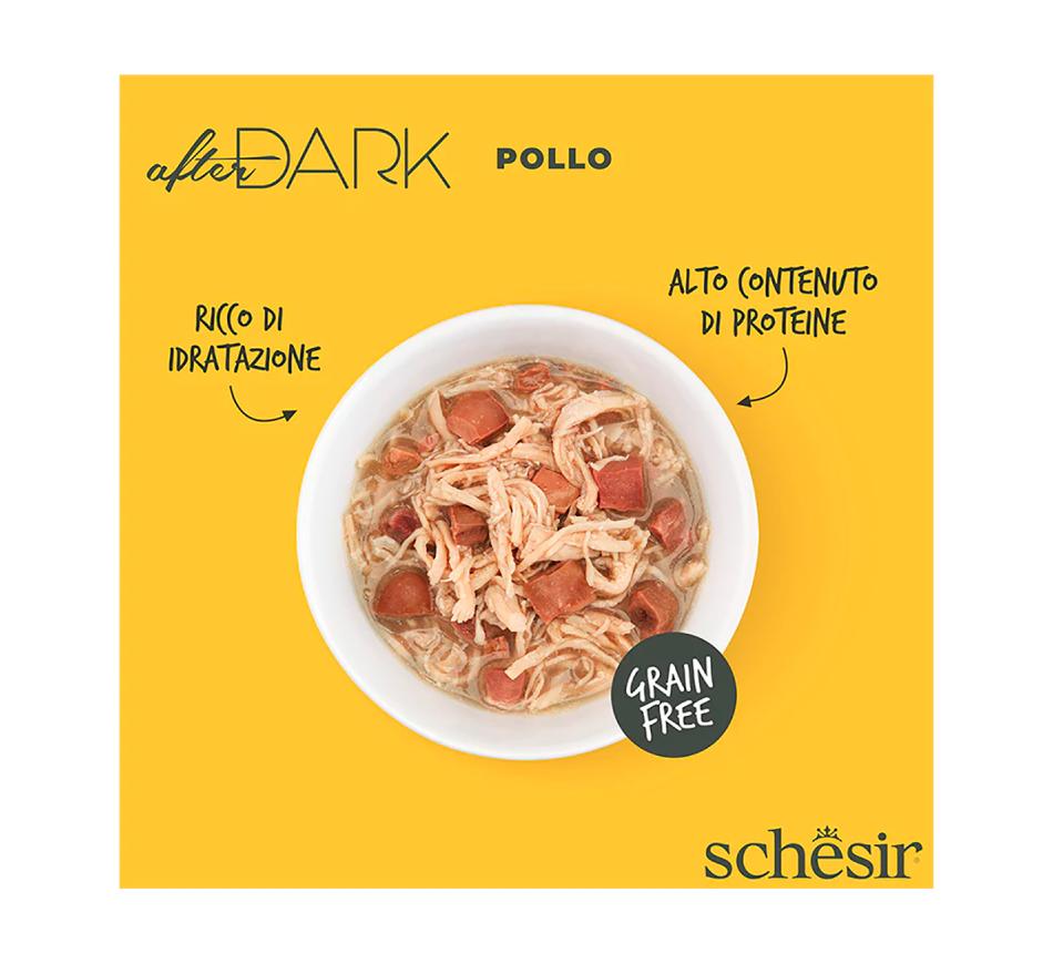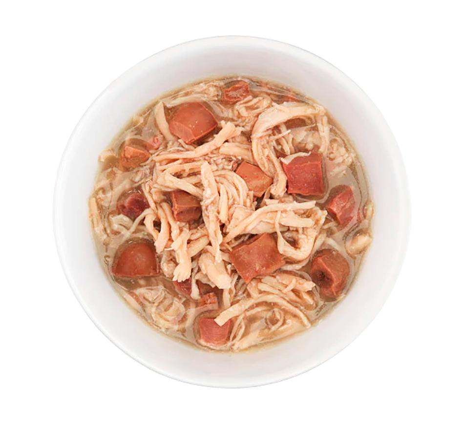 Alto teor de proteínas de filetes de frango em caldo com saborosos e nutritivos pedaços de coração, fígado e moela.