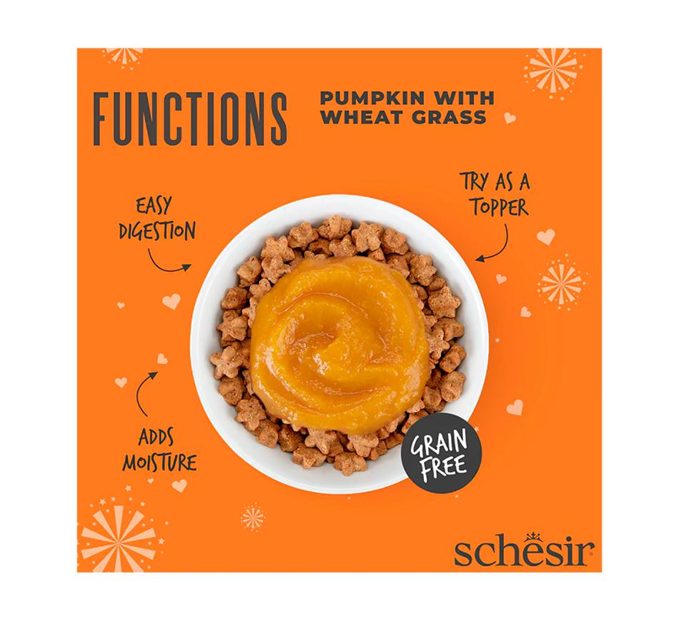 Um topper complementar funcional, de receita simples e de consistência agradável, à base de abóbora misturada com adição de erva de trigo, para apoiar gatos com digestão sensível.