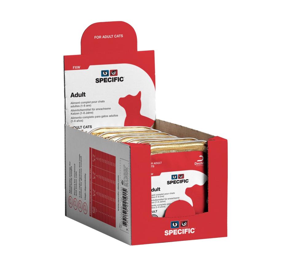 Specific Adult Wet é uma dieta húmida diária para gatos adultos saudáveis menos 8 anos, ajuda à manutenção de um trato urinário saudável e controlo de peso depois de um período de redução de peso.