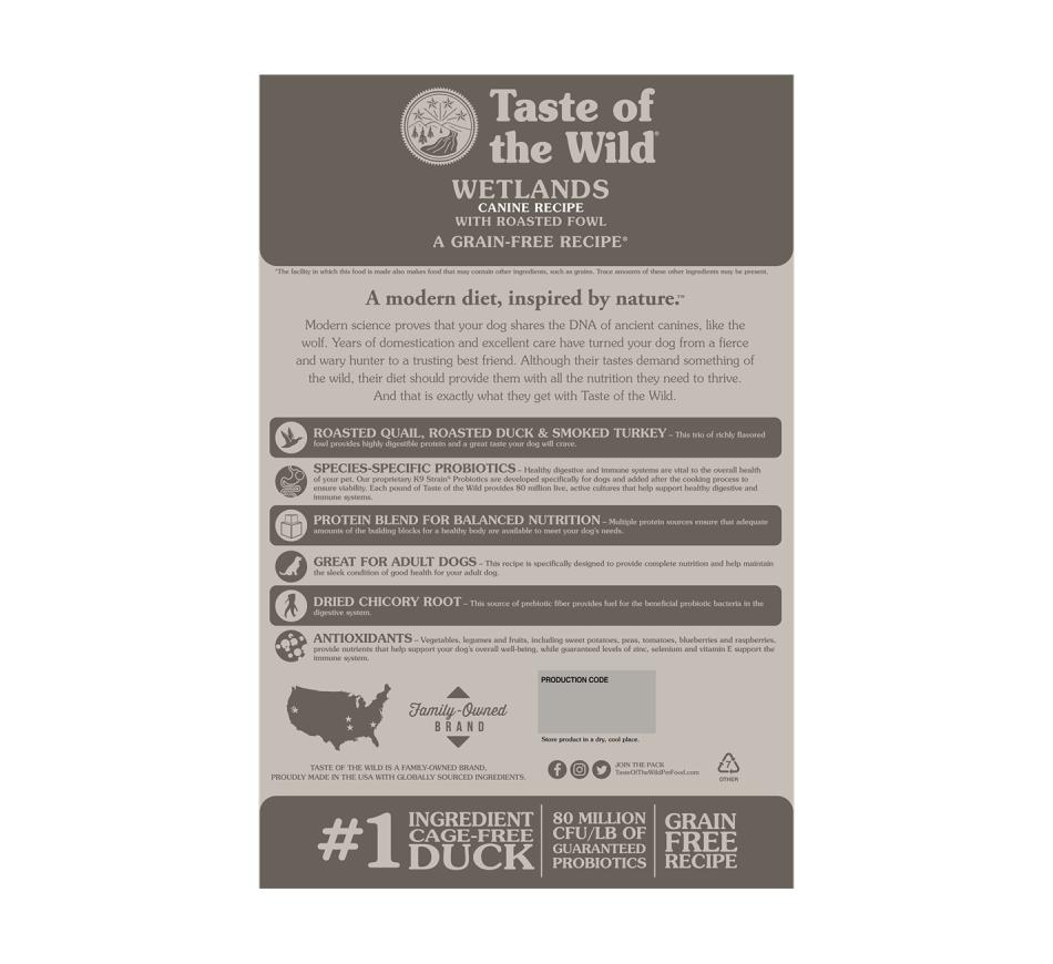 Taste of the Wild Wetlands, com 32% de proteína, é embalada com pato de alta digestibilidade e energia, codorna e peru, juntamente com nutrientes proveniente de vegetais embalados, legumes e frutas. Ingredientes cuidadosamente selecionados para fornecerem proteína de fácil assimilação e com ácidos gordos essenciais para ajudar promover a saúde em geral.