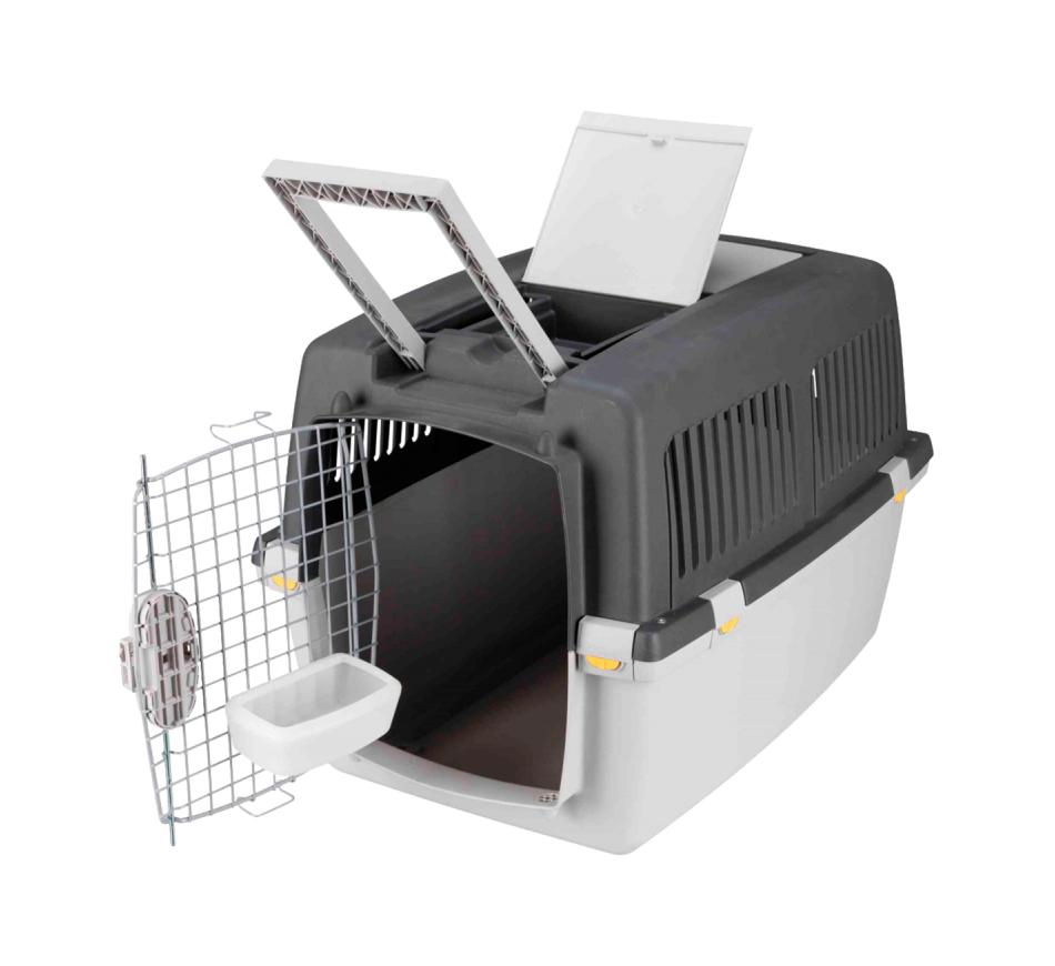 Transportadora Gulliver tem um porta de ferro e um fecho de pressão no seu encaixe de união, por mola das duas partes que compoem as transportadora.