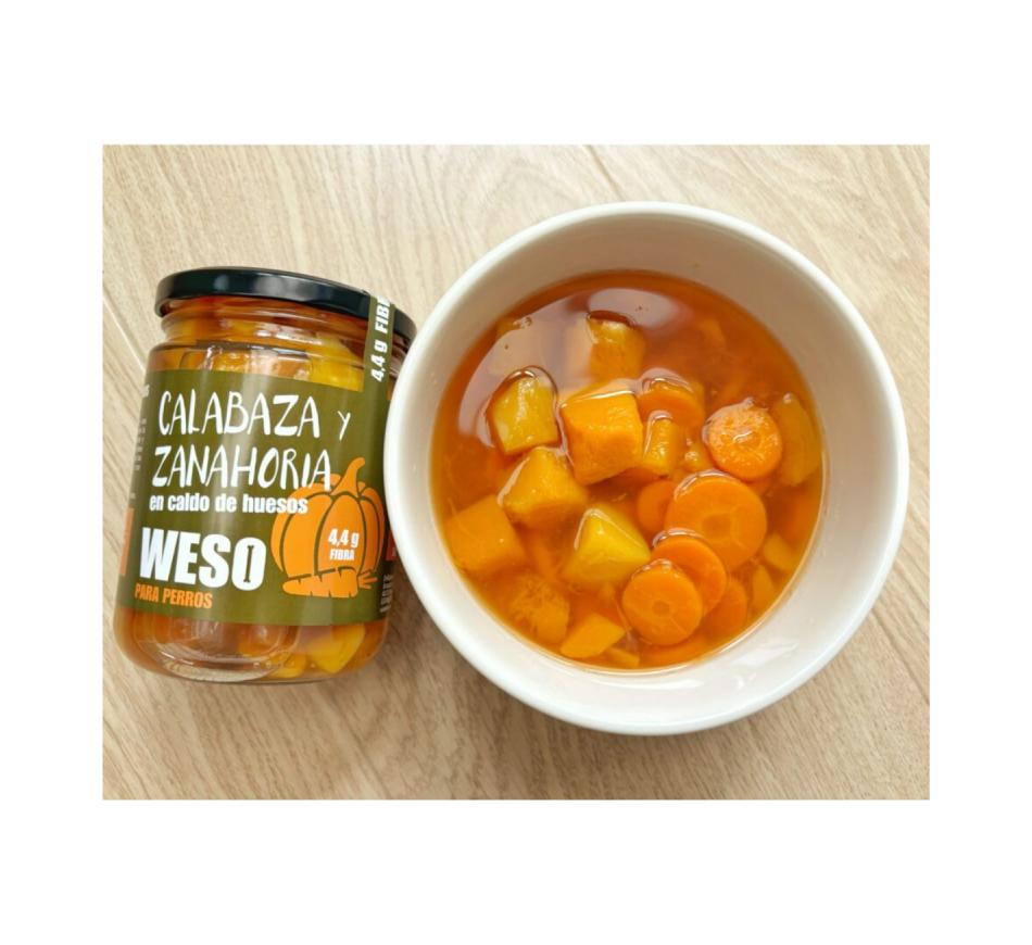 Abóbora e cenoura em caldo de ossos de vaca Weso é natural e indicado para cães, com benefícios para a mobilidade articular, sistema digestivo, hidratação e no controlo do peso.
