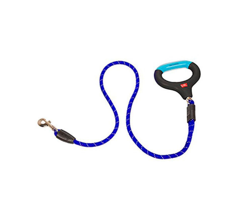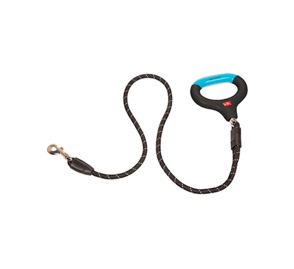 Trela em corda refletora com punho de gel, apresenta um punho em gel que torna esta trela superior no conforto que transmite à mão pois molda-se à sua mão.